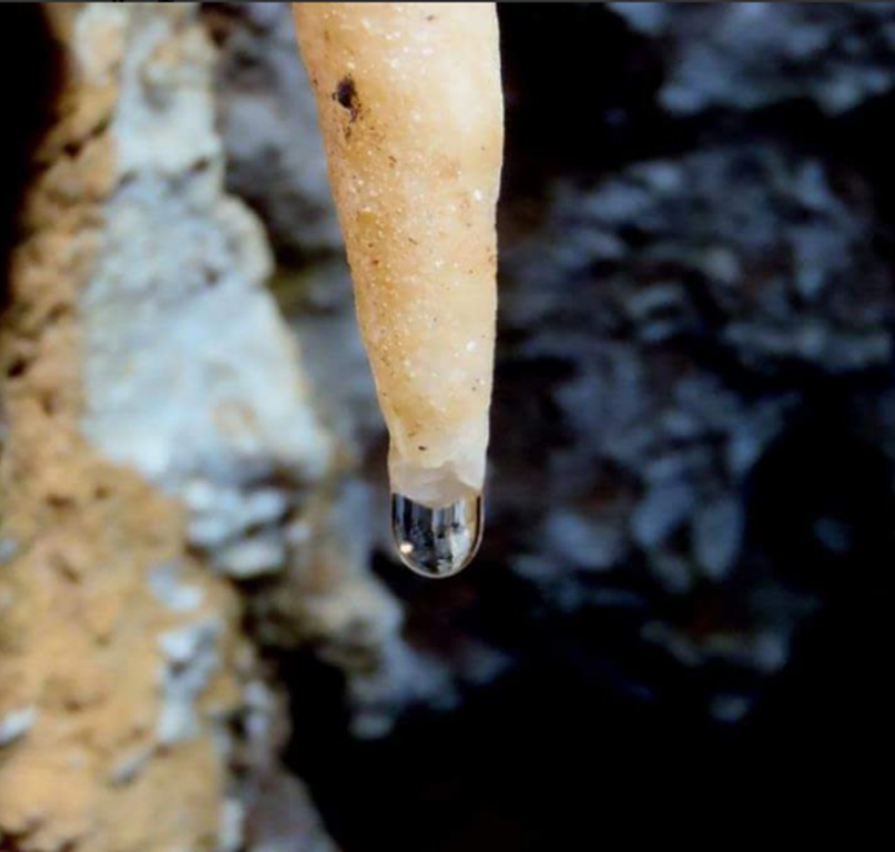 • Estalactites: formam-se por gotejamento através de fendas ou furos no teto. A água desce pela fenda ou furo e, ao chegar ao teto da caverna, para em razão da tensão superficial, formando uma gota. Com isso, o carbonato de cálcio precipita, como um anel em torno da gota. Quando a gota fica grande o suficiente para cair, a água se vai e o carbonato de cálcio fica aderido à rocha. O processo se repete continuamente e assim vai surgindo a estalactite (do grego stalassein, que significa pingar). Os anéis unem-se uns aos outros, formando tubos cilíndricos com 2 a 9 mm de diâmetro interno e paredes com aproximadamente 0,5 mm de espessura. Esses tubos crescem rumo ao chão, de 6 a 25 mm por século. A forma cônica surge pelo escorrimento da água pela parte externa de suas paredes. A figura à direita mostra estalactites e estalagmites na Gruta do Lago Azul, em Bonito (MS). A cor azul da água deve-se ao carbonato nela dissolvido.