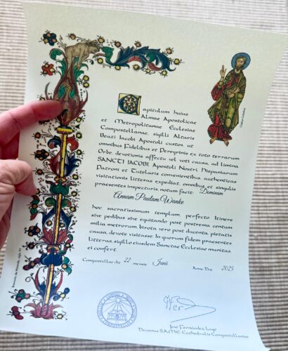Todo peregrino que chega a Santiago e tenha percorrido os últimos 100 km a pé ou 200 km de bicicleta pode ir à Oficina do Peregrino (Rúa Carretas, 33) para buscar sua Compostela. Trata-se do documento que atesta a peregrinação a Santiago, que se comprova através dos carimbos colecionados na Credencial. Antigamente este ritual era realizado na capela da Magdalena, localizada atrás do altar-mor da Catedral. Posteriormente passou à Capela de El Salvador para finalmente com o crescente aumento de peregrinos passou ser feito na Oficina do Peregrino.