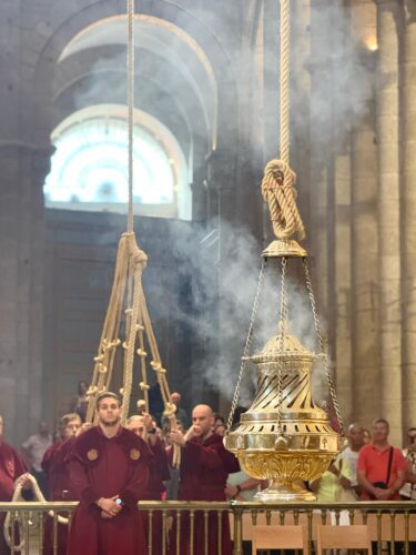 Um dos momentos mais esperados da Missa do Peregrino é assistir ao voo do Botafumeiro, o grande incensário que sobrevoa a nave central da Catedral. Sua origem é incerta, mas consta do Códice Calixtino, pelo que sabemos, no século XII já estava presente na Catedral. Sua função não era outra a não ser purificar a Catedral de Santiago diante da presença de peregrinos chegados das mais diversas partes da Europa (e hoje do mundo).