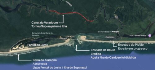 Esse texto é para esclarecer e alertar sobre os vários impactos que estão acontecendo no coração do complexo estuarino Lagamar, entre São Paulo e Paraná. Como uma intervenção humana aparentemente simples está provocando mudanças profundas na paisagem e nos ecossistemas. A história envolve o Canal do Varadouro, o esporão arenoso de Ararapira e os impactos cada vez mais visíveis na saída do rio Ararapira para o mar.