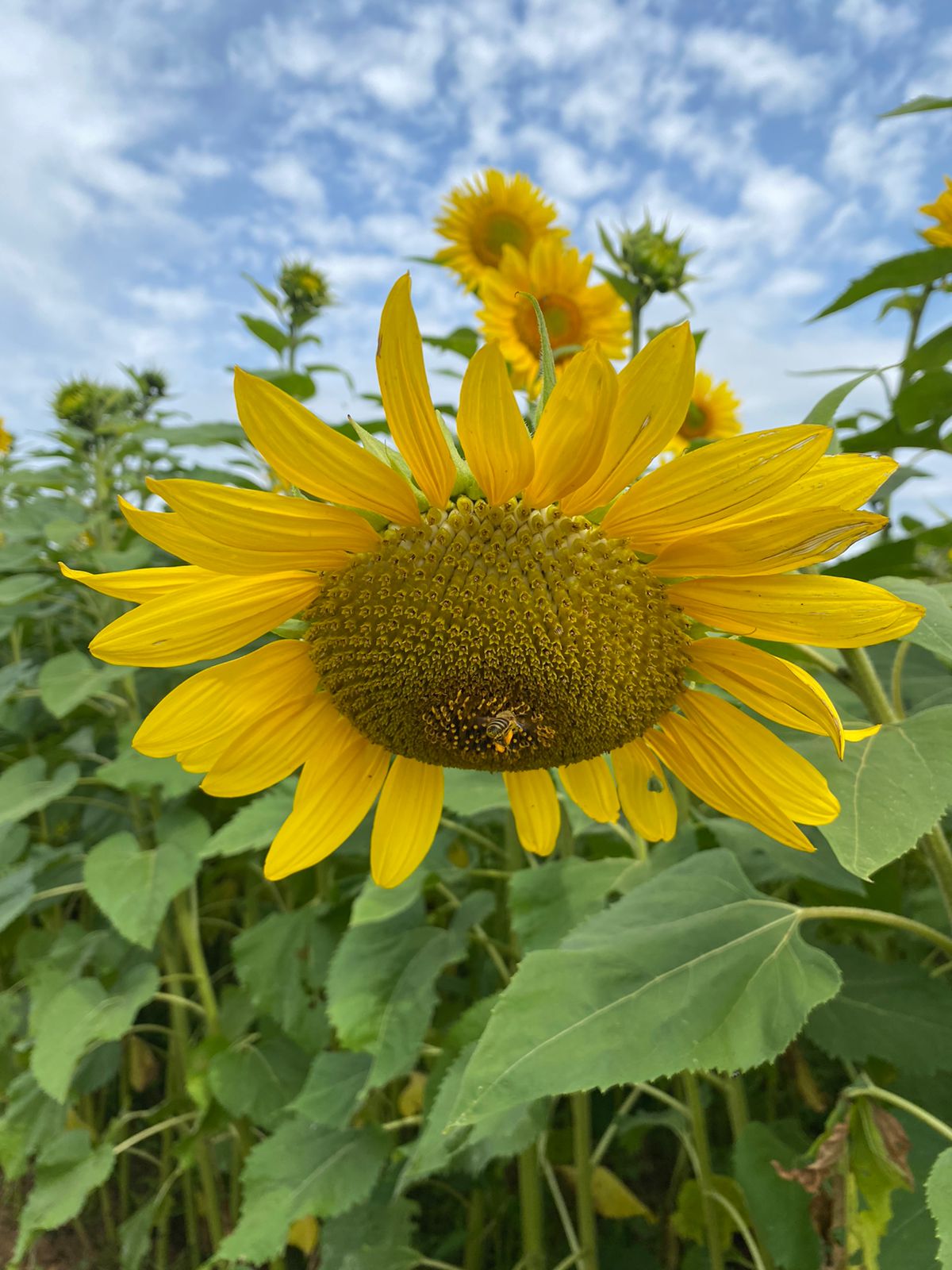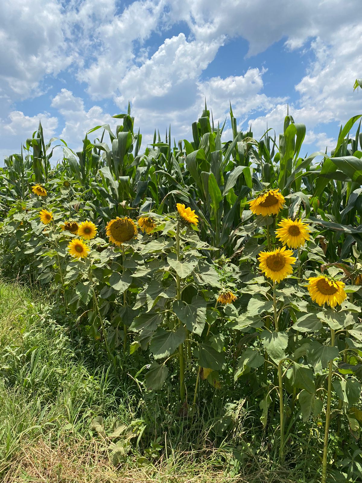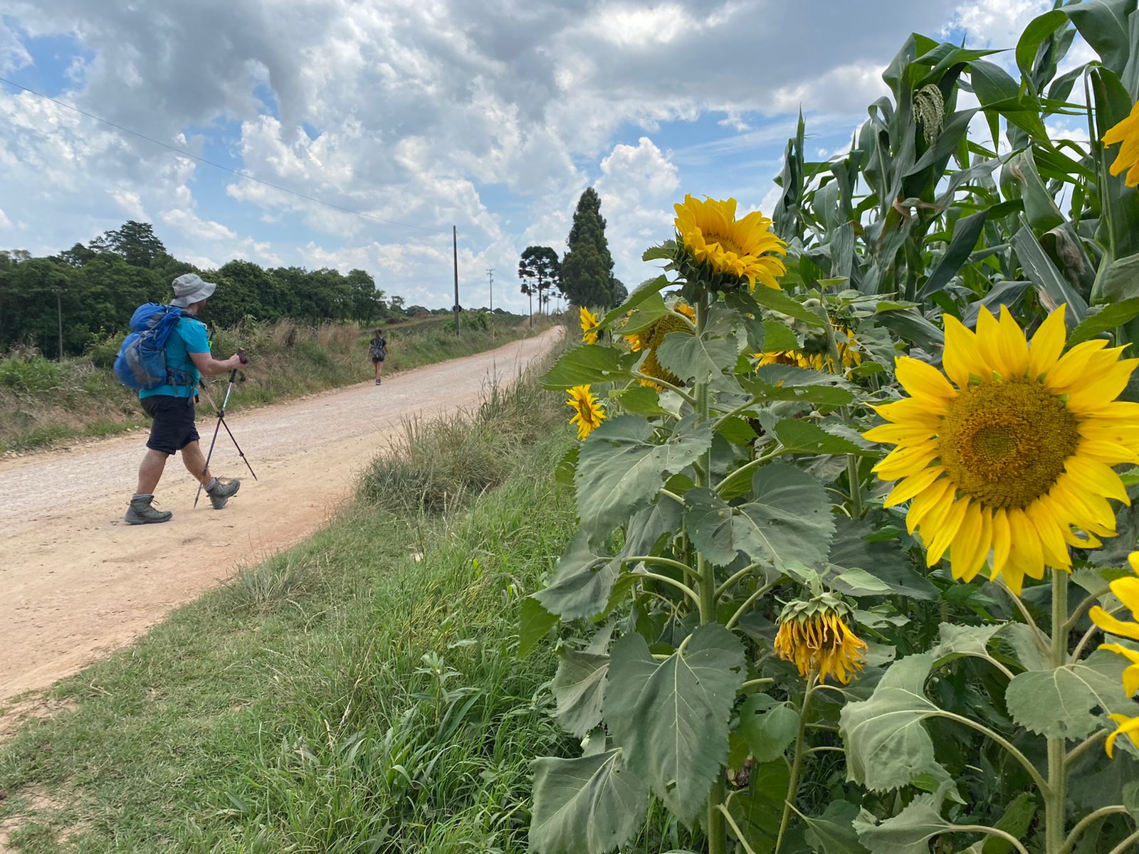 Isso, vamos aproveitar a florada tardia desse campo de girassóis para tirar muitas fotos e dar um impulso para o resto da caminhada que será por estradas rurais.