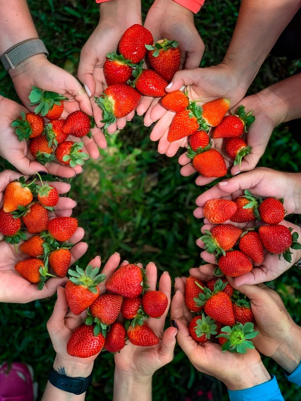 Iniciamos a caminhada em um parreiral onde você poderá comprar uvas e pêssegos. No meio da caminhada faremos uma parada programada para colher morangos orgânicos. O carro de apoio estará junto para carregar seus morangos colhidos e comprados para você seguir caminhando. O sabor desses morangos é indescritível!