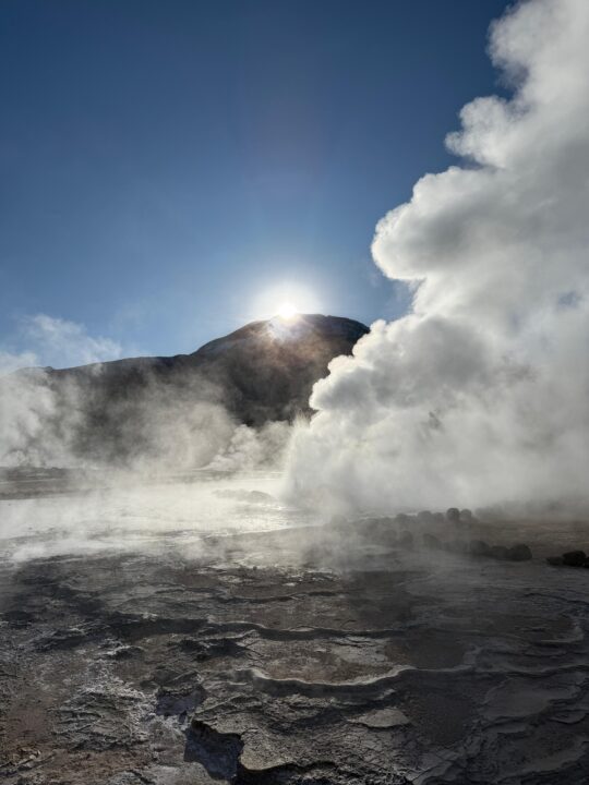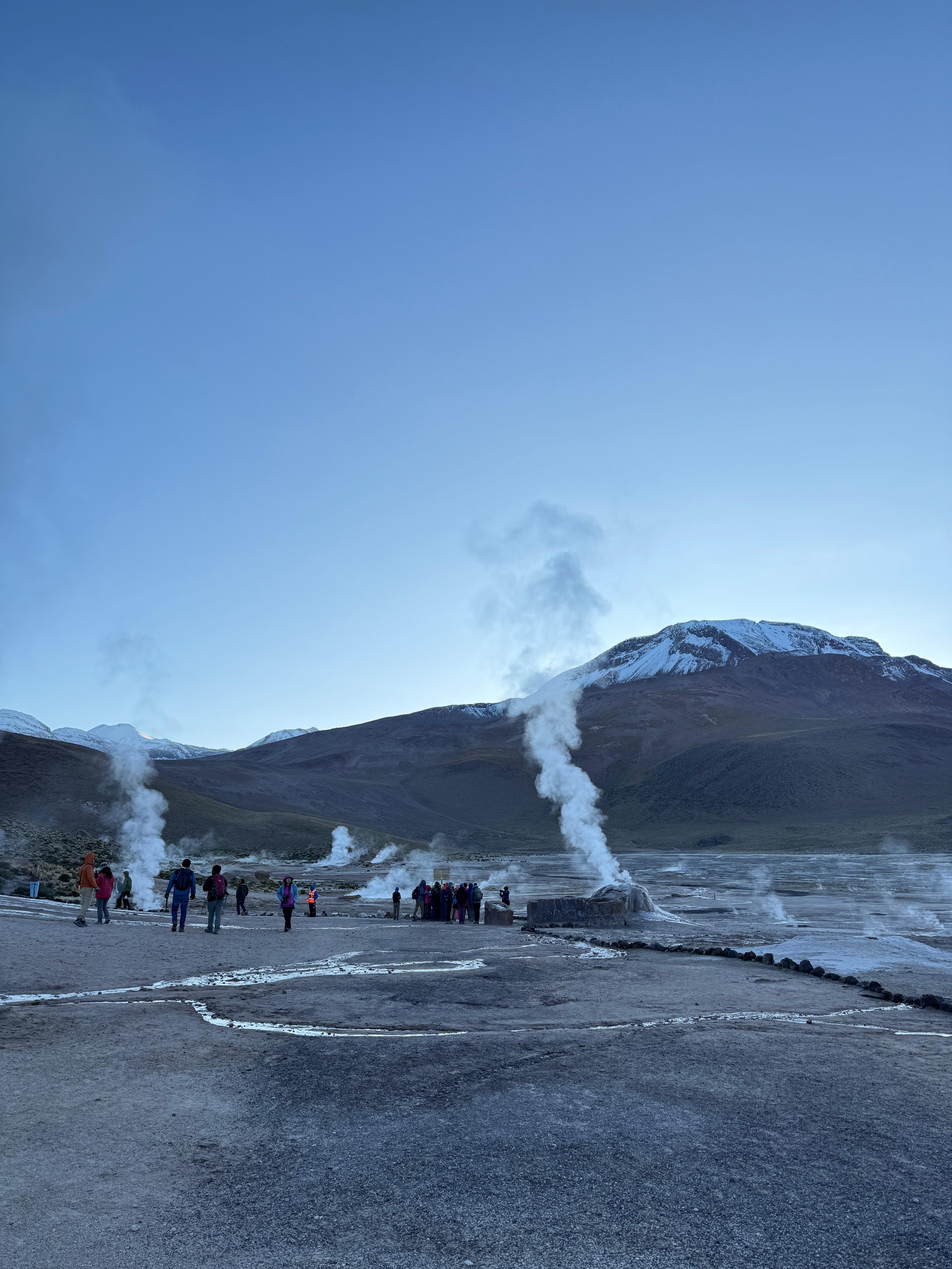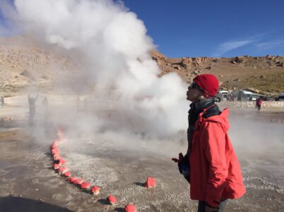 - Manhã: Sairemos muito cedo, de madrugada, em direção ao maior grupo de geyser do hemisfério Sul e o terceiro maior do mundo. El Tatio (palavra Tata-iu), em kunza, que significa o “o avô que chora”. Depois que passear por entre os vários geyseres impressionantes vamos tomar nosso delicioso café da manhã com este cenário de fundo. Voltando a San Pedro de Atacama, pararemos na aldeia de Machuca e visitaremos a Igreja de São Santiago, patrono da cidade.